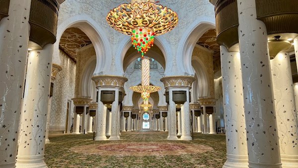 - Seven 24-carat galvanized gold-plated chandeliers made of Swarovski crystal enhance the beauty of the mosque.